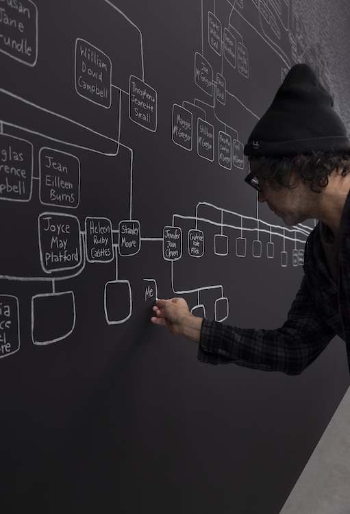 At the very centre of this vast universe of thousands of chalked names is a single, powerful gesture: the word “me.” As Buttrose explains, it’s a way of “inscribing the audience in front of themselves in the work.” Finding “me” at the heart of it is the key. It’s not the beginning of a story looking back, but the artist is in the centre of a vast, sprawling universe of family. At times, the names feel like a constellation in the night sky. The lineage expands in all directions, tracing Moore’s Kamilaroi/Bigambul, British, and Scottish heritage over 2,400 generations.